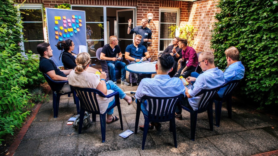 Jan Lingenbrinck und sein Team vom EDEKA Food Tech Campus holten ihre Zuhörer:innen aus der Vergangenheit ab und ermöglichten den Nachwuchskräften einen Einblick in die Zukunft des Einkaufens und Verkaufens. Dass die Zielgruppe durchaus affin für diese Themen ist, bewies sie bereits während der Fortbildungen regelmäßig. Deshalb lag es auch nahe, den Absolvent:innen nicht nur etwas über die Zukunft zu erzählen, sondern sie auch aktiv daran mitarbeiten zu lassen. So schloss sich ein Workshop an, bei dem in Kleingruppen über Ideen und Möglichkeiten von Morgen diskutiert wurde.