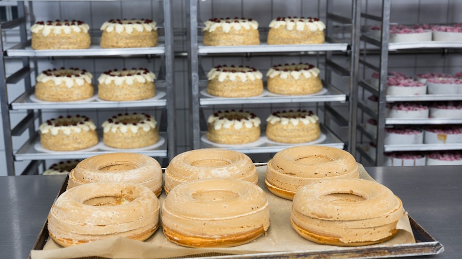 Zunächst werden die Zutaten für die jeweiligen Massen in einem großen Behälter vorgemischt. Alle Zutaten werden dann mit einem großen Knethaken miteinander vermengt. Für den Frankfurter Kranz und die Himbeertorte wird eine Biskuitmasse bestehend aus Weizenmehl, Weizenstärke, Zucker, Eiern und Wasser verarbeitet. Die Biskuitmasse wird dann in die jeweilige Form (Gugelhupf oder Tortenring) eingefüllt und gebacken.