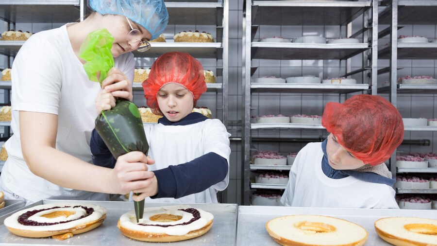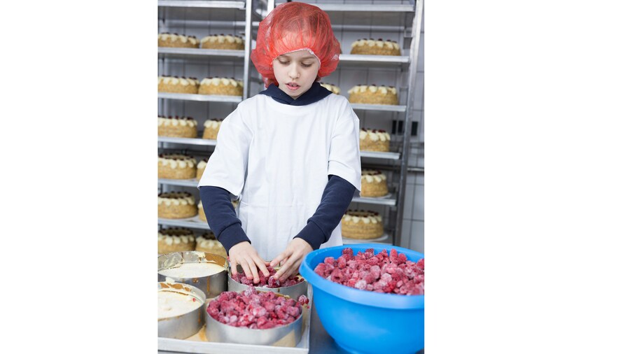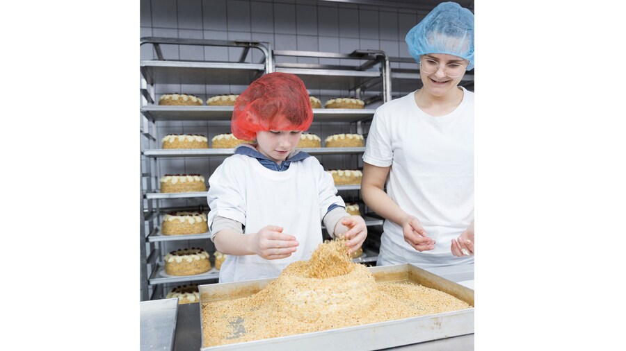 Die Hygienevorschriften bei der Herstellung und Verarbeitung von Lebensmitteln sind sehr streng. Das gilt auch bei Schäfer’s. Also müssen Lea und Justus sich die Hände waschen, sorgfältig desinfizieren und die vorgeschriebene Kleidung anziehen: ein weißes Shirt von Schäfer’s, Sicherheitsschuhe und ein rotes Haarnetz.