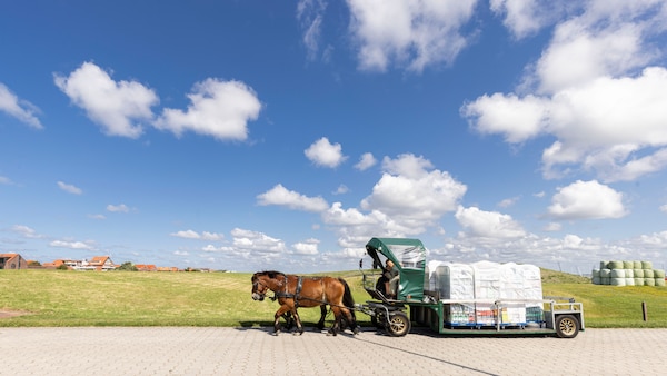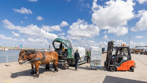 Und jetzt wird es besonders: Auf Juist gibt es keine Autos. Stattdessen leben dort rund 60 Pferde. Starke Kaltblüter – das sind große, ruhige Pferde – ziehen die Anhänger mit den Rollis vom Hafen bis zum Supermarkt. Ziemlich ungewöhnlich, oder? Auf Juist hört man statt Motorengebrumm oft nur Hufgetrappel. Die Rollis und Paletten werden vom Schi? heruntergeholt und auf die Pferdewagen geladen.