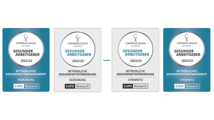 Die Regionalauszeichnung, verliehen von der EUPD Research, erhielten wir für die BGM-Aktivitäten an unseren Verwaltungsstandorten in Chemnitz und Würzburg. Voraus ging ein aufwändiges Audit des Betrieblichen Gesundheitsmanagements mit der renommierten Corporate Health Alliance, welche die Gewinnerbetriebe auditiert und auszeichnet.