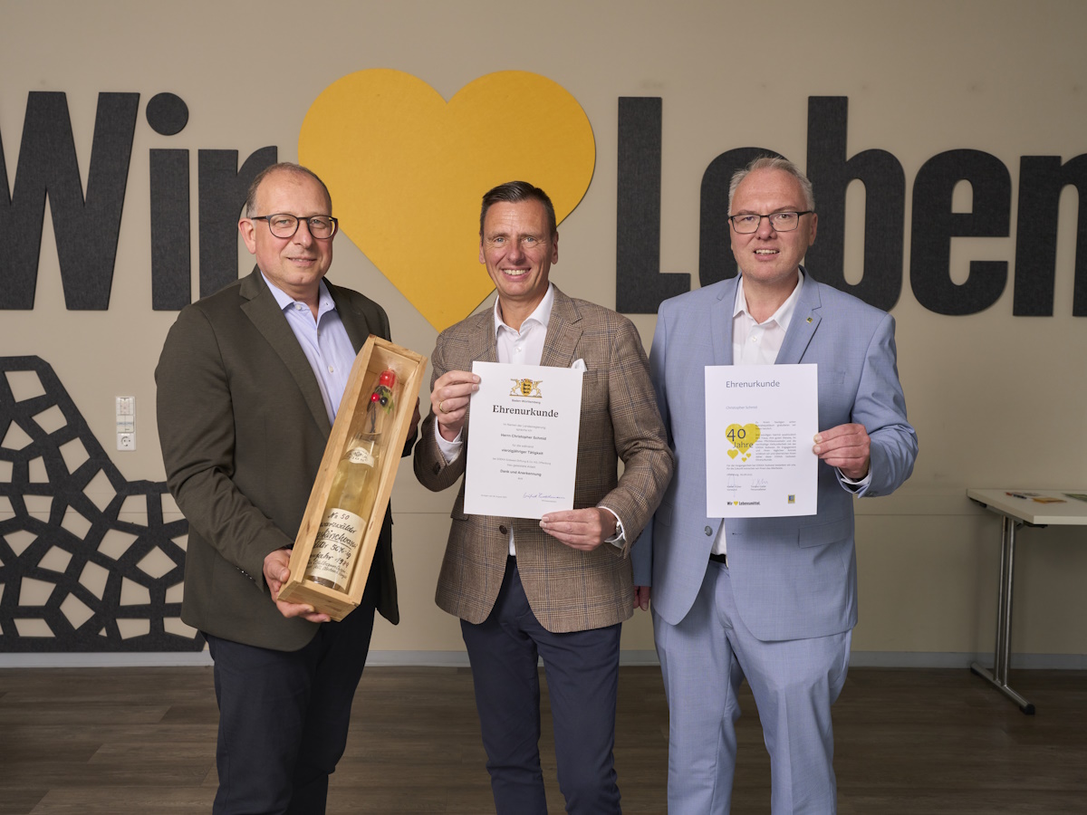Für seine 40-jährige Betriebszugehörigkeit bei EDEKA Südwest wurde kürzlich Christopher Schmid aus Achern geehrt. Rainer Huber, Sprecher des Vorstands EDEKA Südwest, und Patrick Mogck, Vorstand EDEKA Südwest, gratulierten dem Jubilar und überreichten ihm während einer Feierstunde Urkunden sowie ein Präsent als Dankeschön.