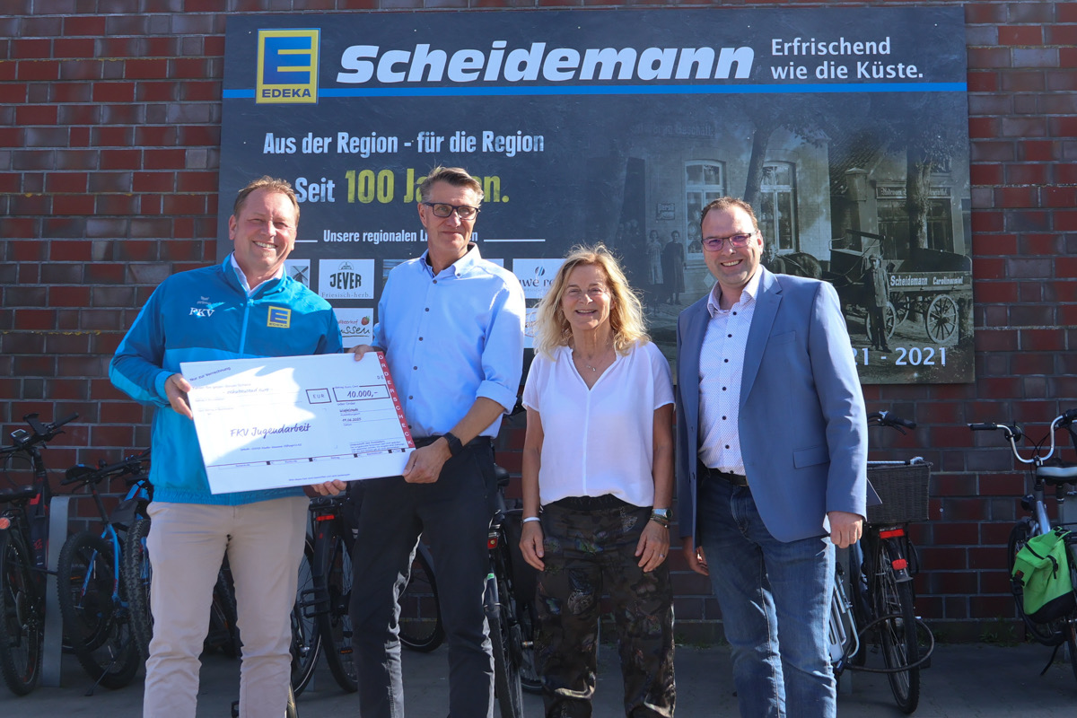 Gemeinsam Gutes tun: Die EDEKA-Kaufleute aus dem Nordwesten unterstützen gemeinsam mit ihren Kunden den friesischen Klootschießerverband mit einer Spende in Höhe von 10.000 Euro. Die Spendensumme ist im Rahmen einer besonderen Aktion zusammengekommen: Beim Verkauf ausgewählter Produkte der regionalen Lieferanten Wolff, Auricher Süßmosterei und Heiko Blume floss ein bestimmter Cent-Betrag pro verkauftem Artikel in den Spendentopf. Die EDEKA Minden-Hannover rundete den Betrag auf insgesamt 10.000 Euro auf. Der symbolische Spendenscheck wurde nun bei EDEKA Scheidemann in Neuharlingersiel von dem selbstständigen EDEKA-Kaufmann Carl Scheidemann, EDEKA-Projektleiterin Marie Ubben sowie Vertriebsleiter Nordwest Hans Körte an Helfried Götz, Vorsitzender des Friesischen Klootschießerverbandes, überreicht.