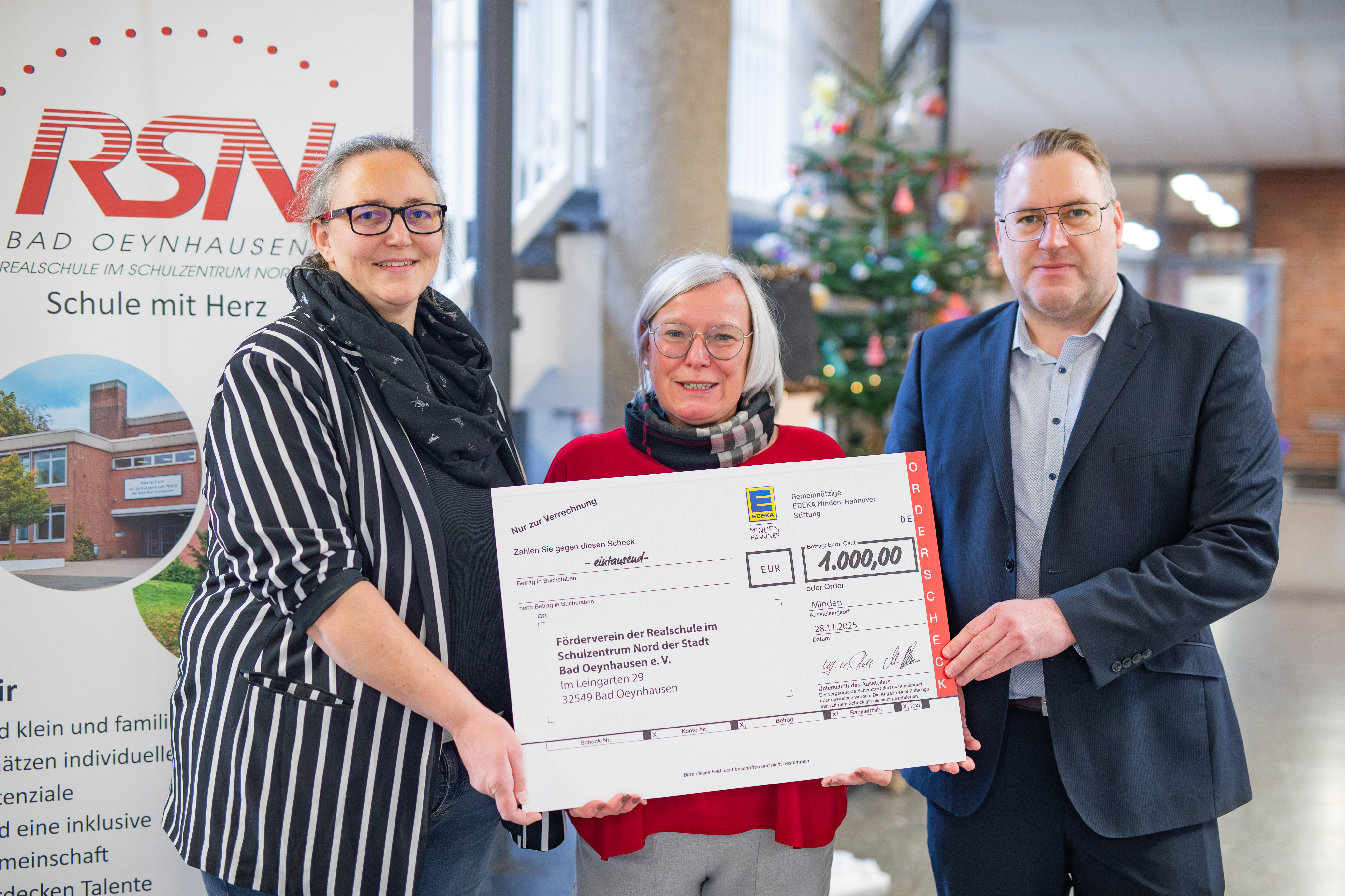 Die gemeinnützige EDEKA Minden-Hannover Stiftung spendet 1.000 Euro an den Förderverein der Realschule Nord in Bad Oeynhausen. Mit der Zuwendung werden bedürftige Familien mit der wichtigen Hausaufgabenbetreuung im offenen Ganztag der Klassen 5 und 6 unterstützt.
