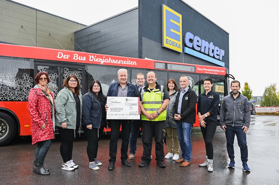 Die gemeinnützige EDEKA Minden-Hannover Stiftung spendet 2.500 Euro an den „Bus Vierjahreszeiten e. V.“. Als Vertreter der EDEKA Minden-Hannover übergaben Thomas Beyer, Anett Grey und Steven Wienskowski auch im Namen der Kaufleute der Halleschen EDEKA-Märkte den symbolischen Spendenscheck an den Verein. Der Bus wird von Familie Strübing aus Halle betrieben, David Strübing fährt mit ihm dreimal pro Woche durch die Stadt und das zu jeder Jahreszeit und ebenfalls an Feiertagen. Die „Gäste“ im Bus erhalten hier warme Kleidung und verschiedene Tees und Suppen, welche Diana Strübing zusammen mit ihrer Tochter jeweils frisch kocht. Im Sommer werden Erfrischungsgetränke angeboten. Neben den Sachspenden nimmt sich das Team auch die Zeit, um Gespräche mit den „Gästen“ zu führen. An manchen Tagen gibt es auch Angebote von einer Diplom-Psychologin der CompetenzWerkstatt Beruf gGmbH. Diese Organisation unterstützt ebenfalls mit Mahlzeiten.