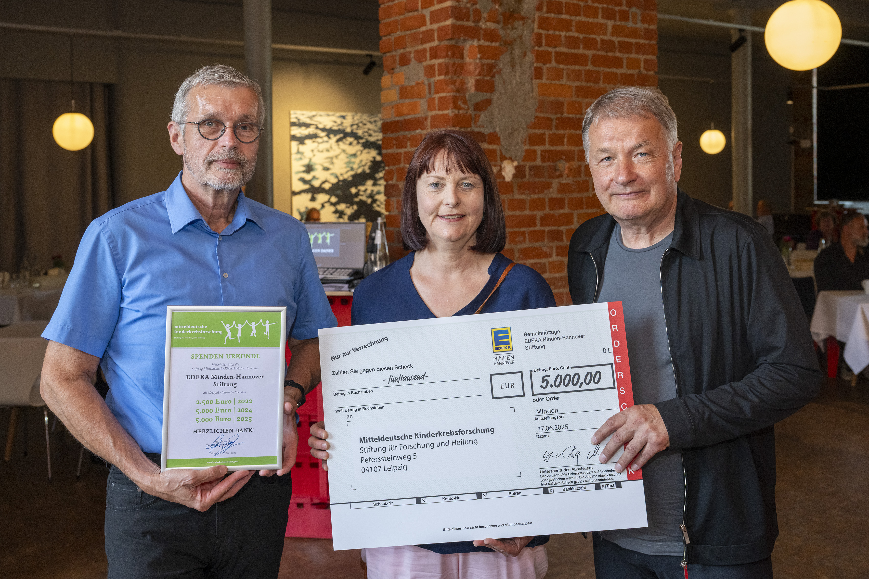 Die gemeinnützige EDEKA Minden-Hannover Stiftung spendet 5.000 Euro an die Mitteldeutsche Kinderkrebsforschung – Stiftung für Forschung und Heilung. Die Übergabe erfolgte im Rahmen einer Veranstaltung der Mitteldeutschen Kinderkrebsforschung in der Spinnerei Leipzig. Vor Ort übergaben EDEKA-Stiftungsbotschafter Axel Kowalski und Anett Grey (beide regionaler Vertrieb bei der EDEKA Minden-Hannover in Sachsen-Anhalt) den symbolischen Spendenscheck an Schauspieler Thomas Rühmann, Botschafter der Mitteldeutschen Kinderkrebsforschung.