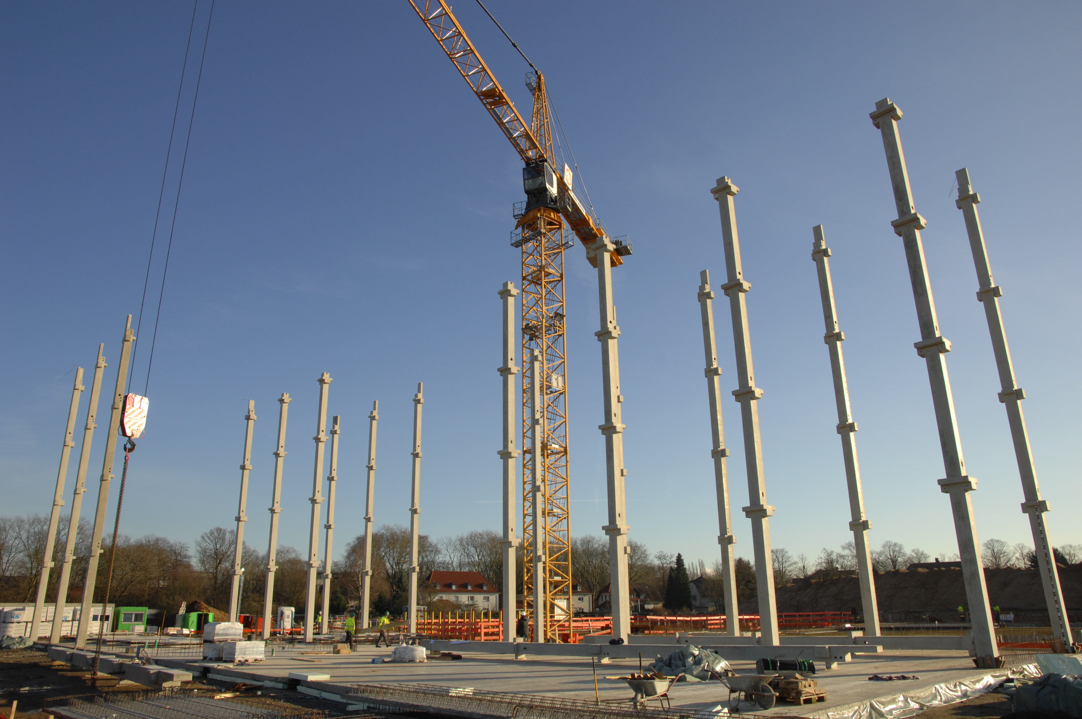 Für das künftige Verwaltungsgebäude am EDEKA Platz gehen die Bauarbeiten in eine neue Phase. Mitte Januar wurden die ersten Stützpfeiler gesetzt, die als tragende Elemente den Kern des Rohbausbilden. Sie sind wichtige Säulen für die Skelettkonstruktion, die im finalen Bauabschnitt in Trocken- und Leichtbauweise ausgebaut wird. Die wesentlichen Aushubarbeiten für das Verwaltungsgebäude wurden abgeschlossen, die Bodenplatte wurde bereits im Dezember gegossen.