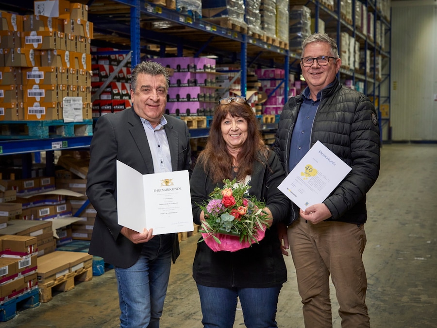 Für ihre 40-jährige Betriebszugehörigkeit bei EDEKA Südwest wurde Elvira Kölz aus Offenburg geehrt. Betriebsleiter Peter Ganteführer und Lagerleiter Andreas Doll gratulierten der Jubilarin und überreichten ihr eine Urkunde sowie einen Blumenstrauß als Dankeschön.