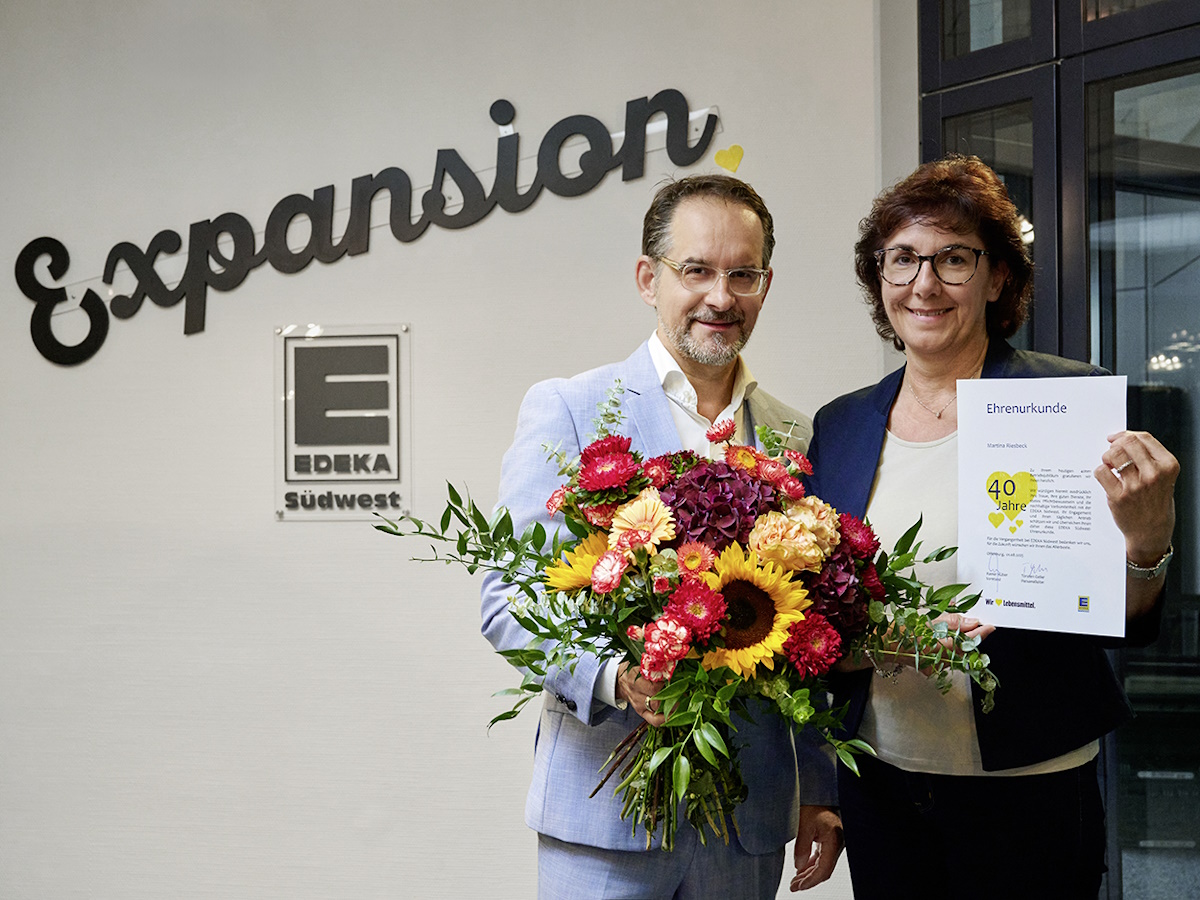 Mit einer Ausbildung zur Kauffrau für Groß- und Außenhandel startete Martina Riesbeck im August 1985 ihre Karriere bei EDEKA Südwest in Offenburg. Nach erfolgreichem Abschluss arbeitete sie zunächst im Produktionsbetrieb von EDEKA Südwest, dem Ortenauer Weinkeller, bevor sie das Sekretariat für den damaligen Direktor Pfundstein übernahm. In den darauffolgenden Jahren war Martina Riesbeck in unterschiedlichen Geschäftsbereichen des Lebensmittelhändlers, wie beispielweise der Allgemeinen Verwaltung, sowie als Assistenz der Geschäftsführung tätig und absolvierte regelmäßig verschiedene Schulungen, um sich weiterzubilden. Seit 2021 arbeitet die Jubilarin als Assistentin der Geschäftsbereichsleitung Expansion. „Frau Riesbeck ist ein absolutes Organisationstalent, durchsetzungsstark und immer sehr gewissenhaft“, lobte Wolfgang Seiler die Jubilarin im Rahmen der Urkundenübergabe und fügte hinzu: „Durch ihre hilfsbereite und loyale Art ist sie außerdem bei allen sehr beliebt.“