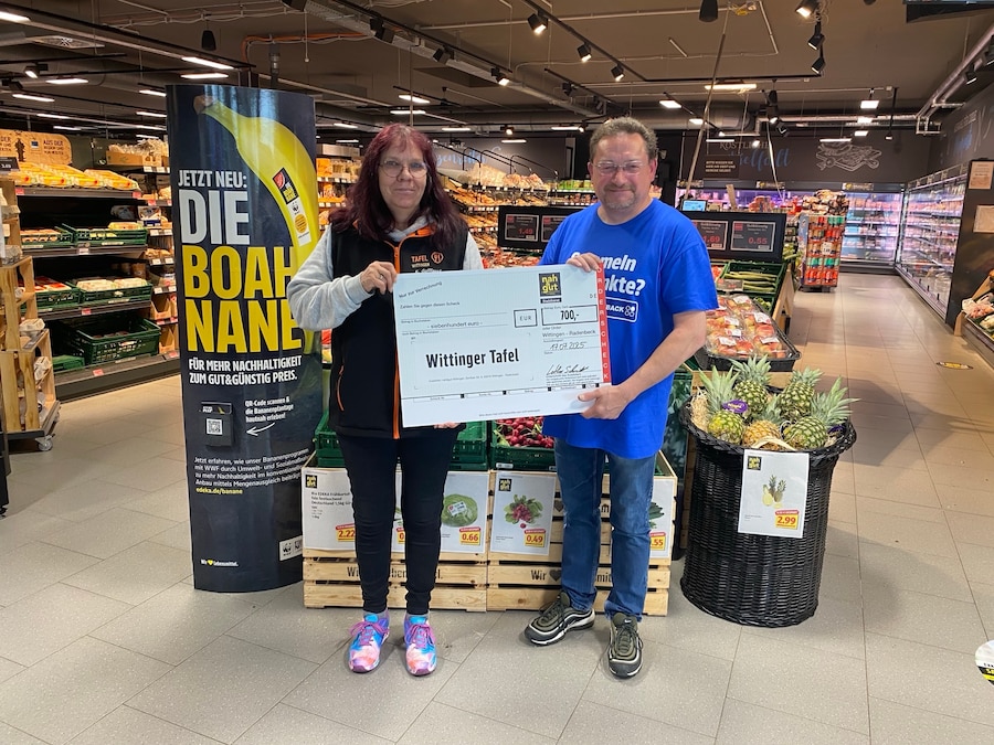 Dank der zahlreichen Pfandspenden der Kunden im nah & gut Wittingen konnten jetzt 700 Euro an die Tafel Wittingen gespendet werden. Teamleiter Lothar Schmidt übergab den symbolischen Spendenscheck an die erste Vorsitzende der Wittinger Tafel, Kerstin Gailliaert. Die Tafel Wittingen ist eine von über 970 Tafeln in Deutschland mit der Mission, Lebensmittel zu retten und damit armutsbetroffenen Menschen zu helfen. Die gemeinnützige Organisation finanziert sich ausschließlich durch Spenden und Mitgliedsbeiträge und setzt sich für Menschen unterhalb der Sozialgrenze ein.