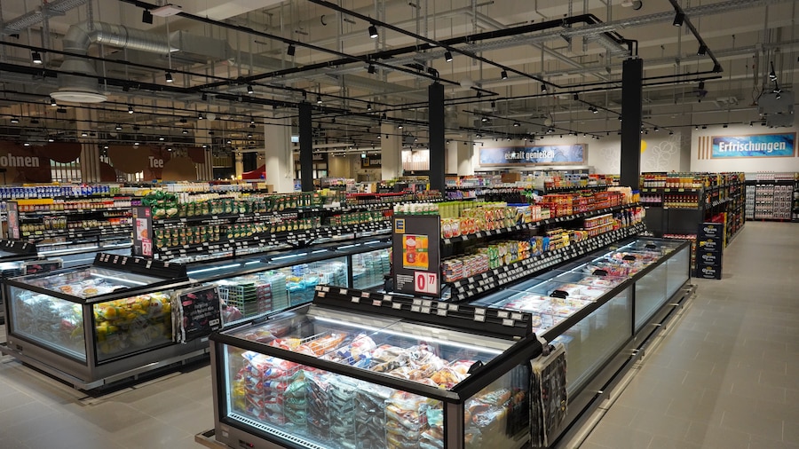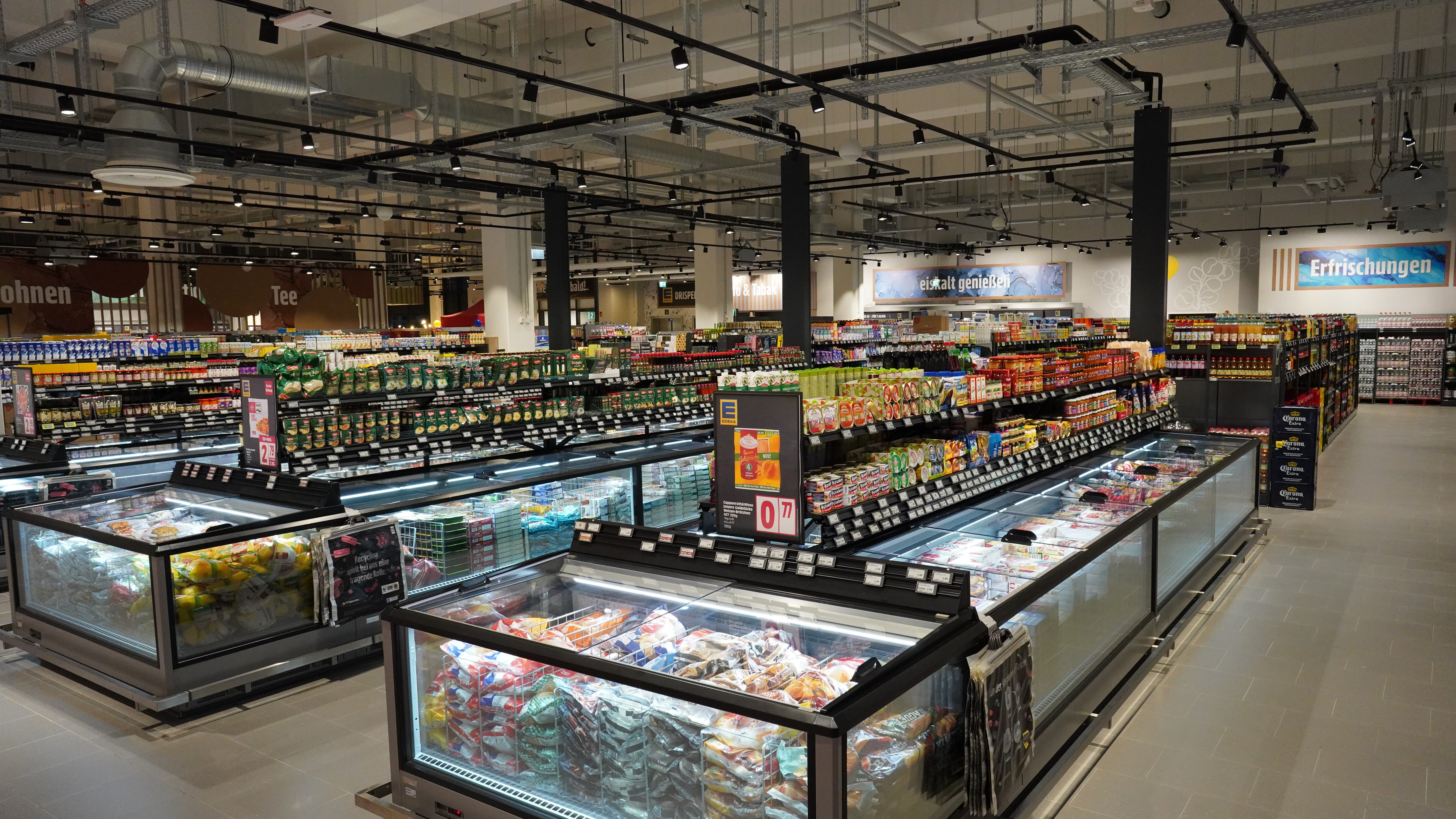Der neue EDEKA Drispenstedt setzt auf moderne, energieeffiziente Technik. Die Kühlmöbel arbeiten mit dem natürlichen Kältemittel CO2 und werden zur konstanteren Temperaturführung mit Glastüren verschlossen. Beheizt wird der Markt mit der Abwärme der Kälteanlagen, ergänzt durch Fernwärme.