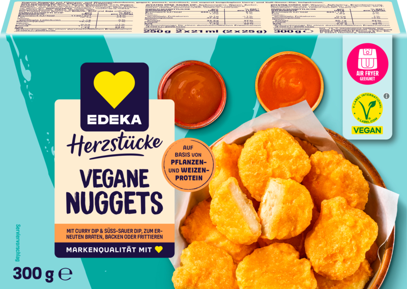 Keine Zeit für aufwendiges Kochen? Kein Problem: Die veganen Nuggets von EDEKA Herzstücke mit knuspriger Panade werden ganz unkompliziert im Ofen gebacken und können danach mit den beiden Dips in den Sorten Curry und Süß-Sauer genossen werden. Die Nuggets werden auf Basis von Pflanzen- und Weizenproteinen hergestellt und sind herrlich knusprig-würzig.