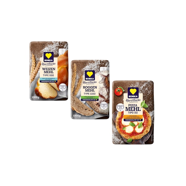 Die EDEKA Herzstücke Spezialmehle bieten die perfekte Grundlage für verschiedenste Rezepte: Das Pizza Mehl ist ideal für einen luftig-knusprigen Boden. Das Roggenmehl hat einen höheren Ballaststoffgehalt und bildet die Grundlage für Herzhaftes wie Roggen- und Mischbrote. Der hohe Proteingehalt des Weizenmehls Backstark sorgt für mehr Backvolumen und eine Gelingsicherheit bei Hefeteigen.