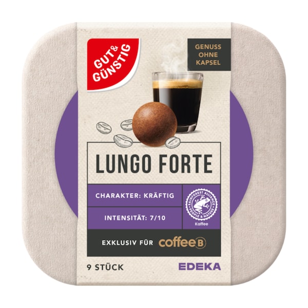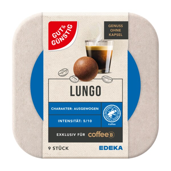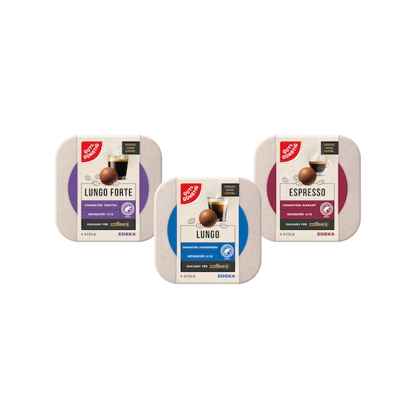 Die GUT&GÜNSTIG Coffee Balls bieten eine Auswahl von drei Sorten, die ideal für alle sind, die geschmacklich keine Kompromisse eingehen wollen: Der ausgewogene und liebliche Lungo mit raffiniertem Aroma, der kräftige und vollmundige Lungo Forte, sowie der elegante und würzige Espresso. Alle drei Sorten stellen eine attraktive, dauerhaft günstigere Alternative zu den Coffee Balls der Markenhersteller dar – und das bei gleichbleibend hohem Genussfaktor.