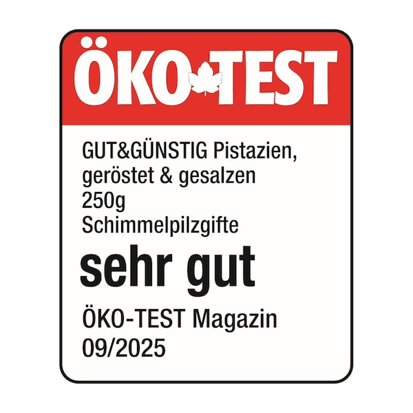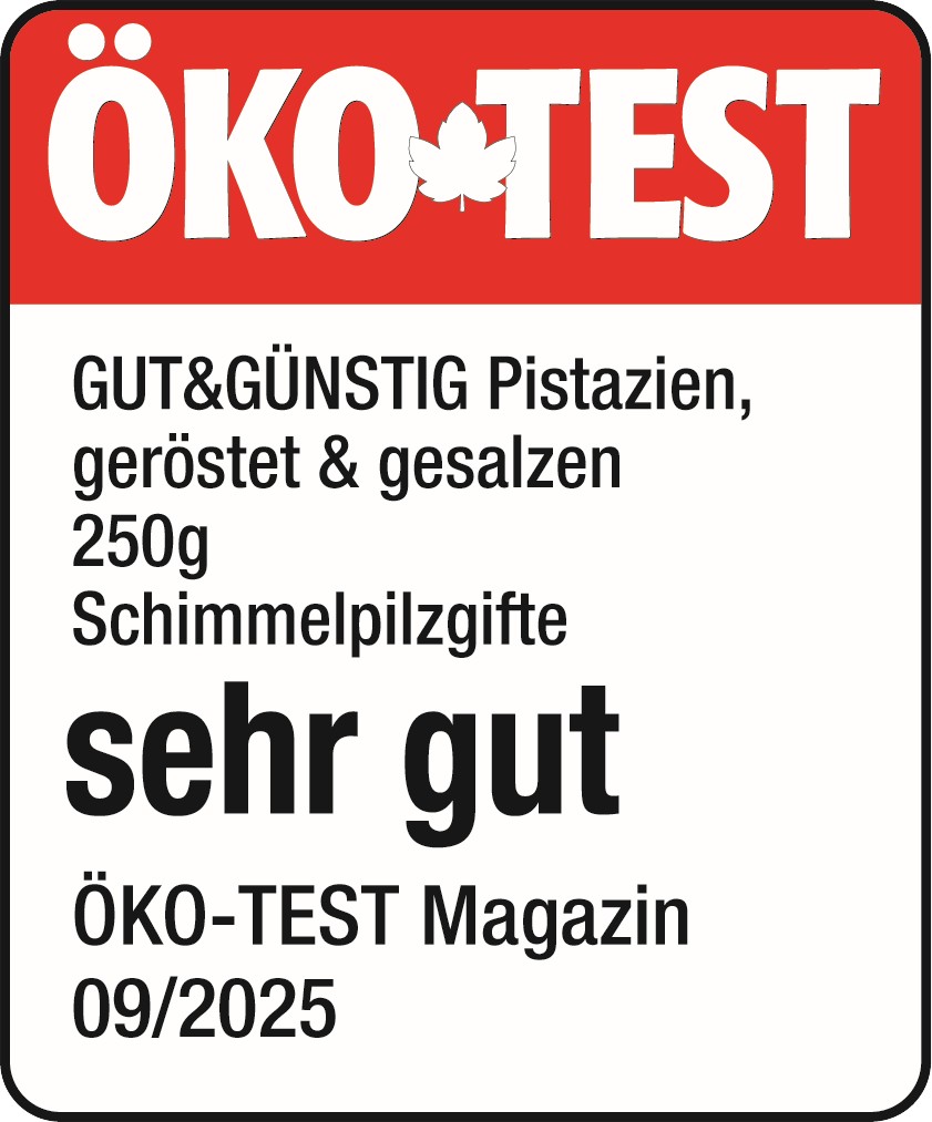 In der September-Ausgabe von ÖKO-TEST (09/2025) wurden gleich in zwei Produktkategorien Eigenmarkenprodukte von EDEKA geprüft, unter anderem Pistazien. Beim Test von 33 Pistazien-Produkten erhielt das Produkt GUT&GÜNSTIG Pistazien gesalzen, ohne Öl geröstet das Urteil „sehr gut“. Die Bestnote „sehr gut“, vergeben von der ÖKO-TEST Redaktion, steht für ein Produkt ohne Belastungen durch Schimmelpilzgifte. Insgesamt erhielten acht der getesteten Produkte das Urteil „sehr gut“ und neun Produkte das Urteil „gut“.