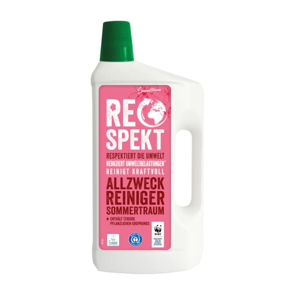 Gründliche Sauberkeit, reines Gewissen: ÖKO-TEST hat insgesamt 26 Allzweckreiniger getestet. Drei Produkte erhielten das Gesamturteil „sehr gut“, darunter auch der RESPEKT Allzweckreiniger „Sommertraum“. Das Produkt überzeugte durch geringe Streifen- und Schlierenbildung sowie glänzende Reinigungsleistung. Ausgezeichnet mit dem EU-Ecolabel, dem Blauen Engel sowie dem WWF Panda bietet der RESPEKT Allzweckreiniger „Sommertraum“ eine umweltbewusstere Lösung für einen rundum sauberen Haushalt. Das spiegelt sich auch in der Verpackung wider: Die Flasche besteht aus 100% Recyclingmaterial.