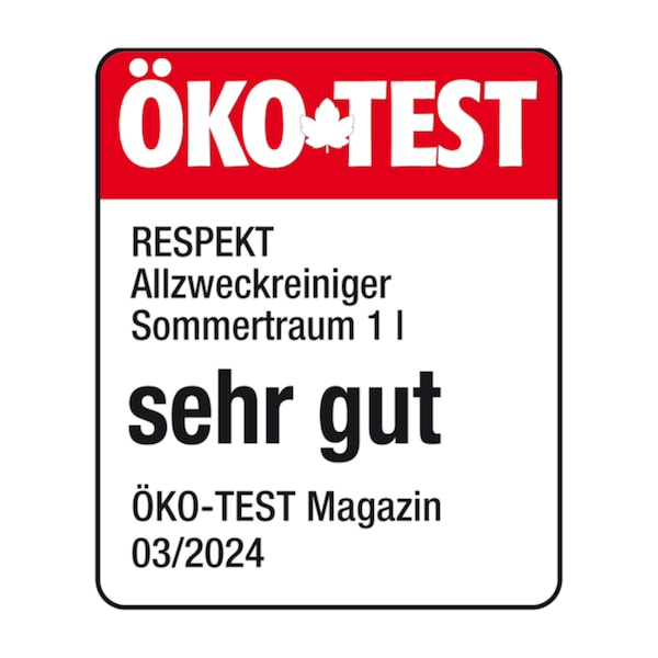 ÖKO-TEST hat im gleichnamigen Verbrauchermagazin (03/2024) 26 Allzweckreiniger unter die Lupe genommen. Das Urteil: Der RESPEKT Allzweckreiniger „Sommertraum“ wurde mit der Bestnote „sehr gut“ bewertet und zählt damit zu den drei am besten bewerteten Produkten im Test.