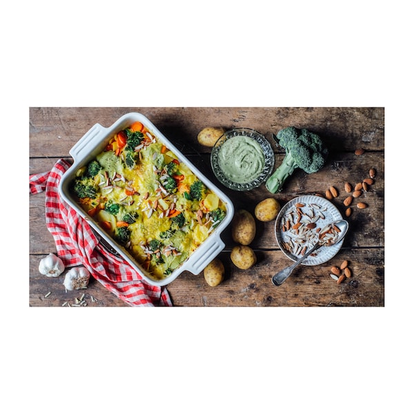 Das Produkt EDEKA MY VEGGIE Reibeschmelz kommt zum Beispiel im Erfolgsrezept Veganer Avocado-Kartoffel-Auflauf der Team D Athletin Jessica von Bredow-Werndl zum Einsatz.