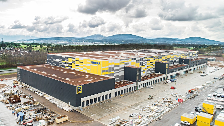 Anhand des sich gegenwärtig im Bau befindlichen Logistik-Zentrums bei Rastatt stellen wir unsere hochkomplexe Logistik-Leistung auf eine zusätzliche Säule. Seinen Spitznamen hat das bereits errichtete Reserve-Hochregallager auch schon weg: „Kathedrale“ nennen es die Bauteams vor Ort ein wenig ehrfürchtig. Der Fokus dieses insgesamt 140-Millionen-Euro-Mammutprojekts an der A5 liegt auf dem Trockensortiment. Also auf Artikeln wie Kaffee und Tee, Süßwaren oder auch Konserven, die wir von hier aus auf unsere Regionallager verteilen werden. Ab 2022 wird das neue Logistik-Drehkreuz sich über eine Fläche von etwa fünf Fußballfeldern (oder 36.000 Quadratmeter) erstrecken. Mehr als sechs Kilometer Fördertechnik werden dann Paletten und Behälter zu ihrem Bestimmungsort in dem Komplex transportieren – und das vollautomatisch. Hinzu kommen ein Bürogebäude mit Sozialräumen für die Belegschaft, ein Parkhaus sowie Warenannahme und Kommissionierhalle. Noch 2021 starten wir mit umfangreichen Testläufen der Logistik- und IT-Prozesse.