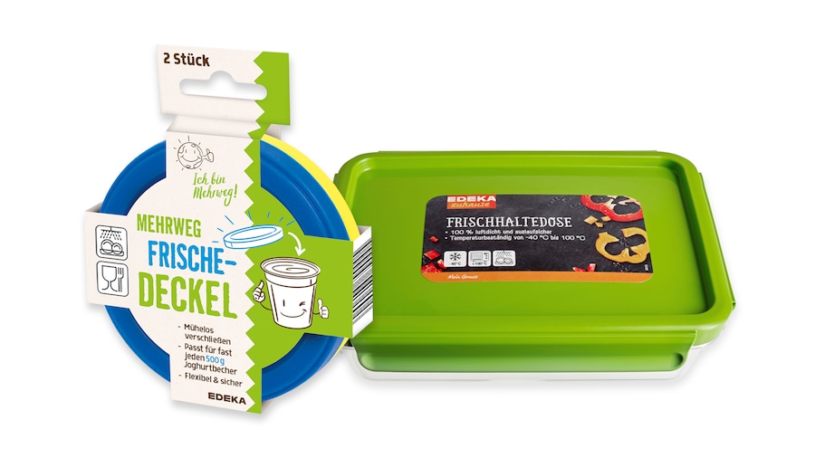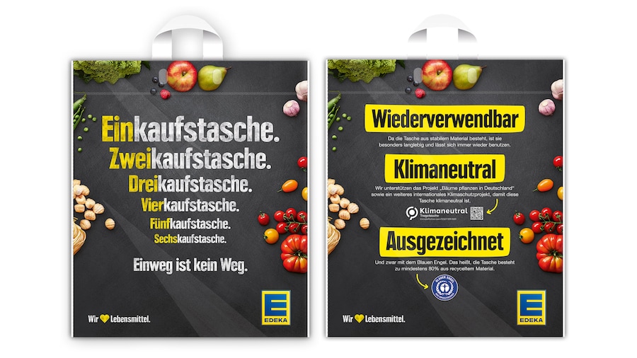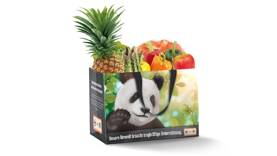 Und so wächst unsere Mehrweg-Familie stetig. Zu ihr gehören waschbare Mehrwegnetze für Obst und Gemüse. Nach und nach setzen wir hier Netze aus 100 Prozent recyceltem Polyester ein. Unsere Mehrweg-Lösungen umfassen zudem Brotbeutel sowie Frischhalteboxen für Fleisch, Wurst und Käse von unseren Servicetheken. Sie bieten wir seit vergangenem Jahr auch als luftdichte und auslaufsichere Edelstahl-Variante an. Aber auch die wollen nachhaltiger eingepackt werden. Und so haben wir 2020 das Sieben-Tragetaschen-Konzept für unsere Märkte ins Leben gerufen. Hierbei dreht sich ebenfalls alles um Tragetaschen aus wiederverwertbaren Materialien. Zum Taschen-Septett gehört eine nassfeste Papiertüte, außerdem klimaneutrale Kunststoff-, Permanent- und Tiefkühltaschen mit mindestens 80 Prozent Recyclinganteil und eine vielseitig (wieder-)verwendbare Etui-Tasche. Ebenfalls erhältlich sind Taschen aus 100-prozentiger Bio-Baumwolle wie auch Transportkartons aus Wellpappe mit 75 Prozent Recyclinganteil und praktische Klappboxen. Sämtliche Varianten sind mit nachhaltigen Siegeln zertifiziert – wie zum Beispiel mit dem FSC-Siegel, dem Blauen Engel oder dem Bioland-Zeichen.