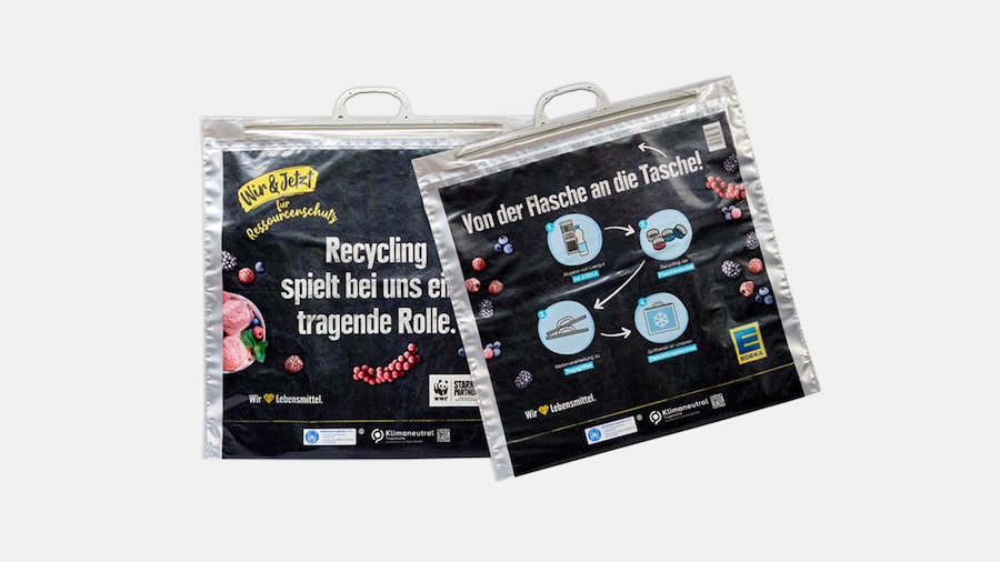 Unsere Freude war groß, als wir im September 2021 den Deutschen Verpackungspreis in der Kategorie „Nachhaltigkeit“ für die EDEKA-Tiefkühltasche erhielten. Ihr Taschenkörper besteht nicht nur zu über 80 Prozent aus Recyclingmaterial. Sondern es wird auch für den Griff Rezyklat aus den Deckeln von Pfand-PET-Getränkeflaschen verwendet, die wir in unseren Märkten von den Kunden einsammeln und zurücknehmen. Die Tasche trägt dank ihres recycelten Kunststoffs den Blauen Engel und ist außerdem mit dem WWF-Logo gekennzeichnet. Der Panda dient unseren Kunden als zusätzliche Orientierungshilfe und Hinweis auf ein nachhaltigeres Produkt.