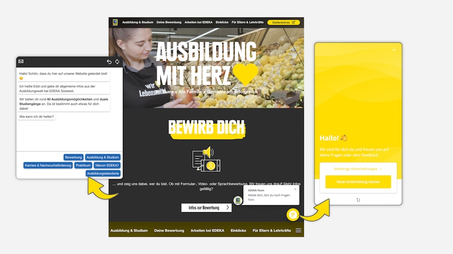 Um geeignete Fachkräfte für unsere EDEKA-Märkte zu finden, nutzen wir seit Ende 2022 zudem die Recruiting-Anwendung „Talk’n’Job“. Sie ermöglicht bequem und individuell sprach- oder chatgesteuerte Bewerbungen. Erste positive Erfahrungen mit „Talk’n’Job“ konnten wir zuvor bereits beim Besetzen von Stellen in unseren Marktbäckereien sammeln. Das niedrigschwellige Angebot eröffnet insbesondere jungen bzw. Smartphone-affinen Menschen neue Wege, mit uns über ihre berufliche Zukunft zu kommunizieren. Anwendungen wie „Talk’n’Job“ sind somit auf einem guten Weg, klassische Bewerbungsformen abzulösen.