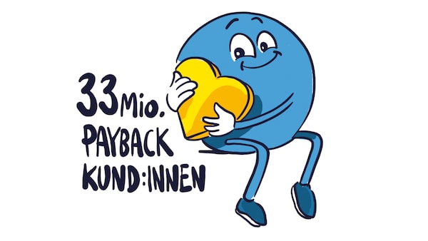 Illustration des blauen Payback-Balls mit Augen, Mund und Beinen. In der Hand ein gelbes Herz.