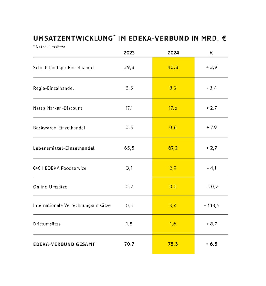 Grafik Nettoumsätze EDEKA-Verbund 2023 bis 2024. Steigung um 6,5 Prozent auf 75,3 Milliarden Euro.