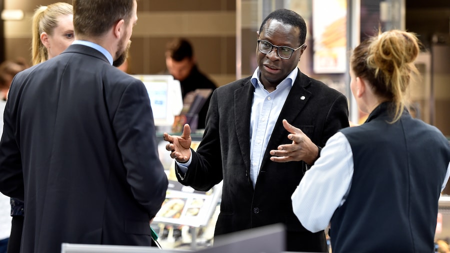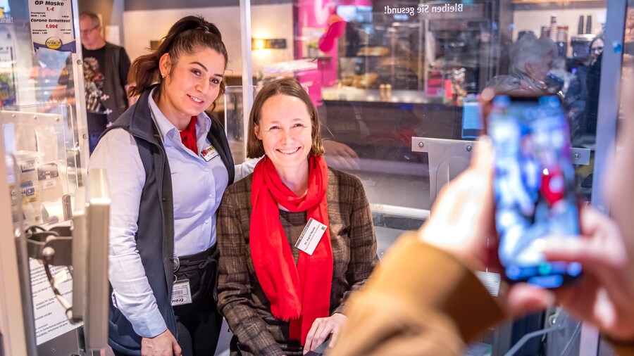 Der Erlös der Kassenaktionen kommt, wie hier mit Dr. Karamba Diaby MdB, einer lokalen und gemeinnützigen Organisation zu Gute.