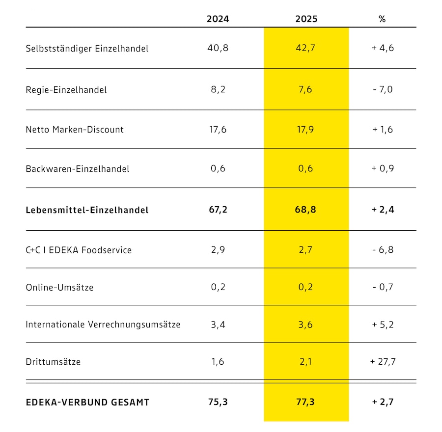 • 77,3 Mrd. Euro Gesamtumsatz erwirtschafteten die Unternehmen im Verbund im Jahr 2025 – damit behauptet EDEKA die Position als Marktführer im deutschen LEH.