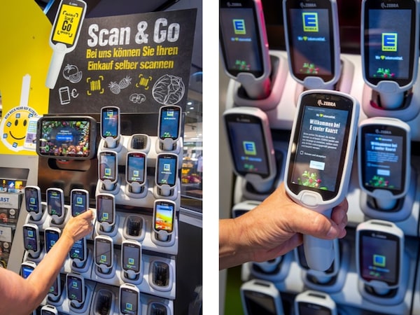 „Es ist ganz einfach", berichtet Marktleiter Kenny Wagner von seinen Erfahrungen im E center im Köngen (Baden-Würtemberg). "Man schnappt sich einen Scanner, scannt jedes Produkt, das man in seinen Einkaufswagen legt, einmal kurz ab, damit man an der Kasse die Waren nicht mehr auf das Kassenband legen muss. Es wird nur der Scanner ausgelesen und man bezahlt. Das spart enorm viel Zeit und unsere Kundinnen und Kunden lieben es.“