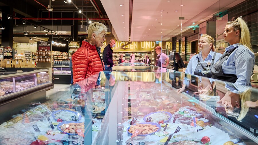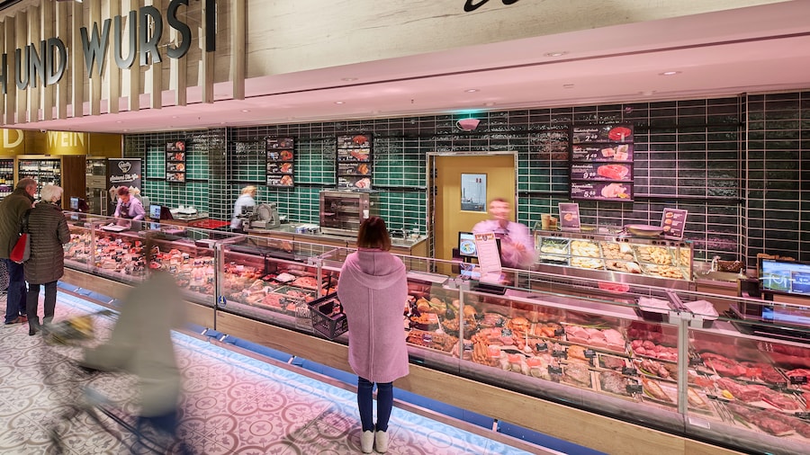 Bei der Laden-Story darf die eigene Geschichte des Unternehmer-Paars selbstverständlich nicht fehlen: Kauffrau Sabah Schulz arbeitete zuvor als Fischfachberaterin bei Rasting, Daniel als Vertriebsleiter. Den dort gesammelten Erfahrungsschatz übertragen die Kaufleute natürlich auf die Bedientheken ihres Marktes. Im Kund:innenlauf des 2.200-Quadratmeter-Markts positionieren sich Fisch, Fleisch und Wurst standardmäßig auf der rechten Seite, Käse und Antipasti befinden sich auf einer Insel gegenüber.