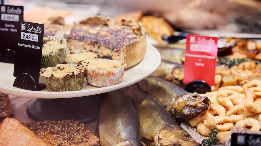 Fischfrikadellen, Thunfischmuffins und gefüllte Lachsrolle sind hausgemachte Highlights beim Fisch. Mit ihrem beruflichen Background liegt Sabah Schulz besonders viel an dieser Abteilung. Wenn das Thekenbild morgens nicht stimmt, zieht sich die selbstständige Kauffrau schnell ihren Kittel an und richtet die Ware neu an. Das Ehepaar Schulz hat hohe Ansprüche an die Theken – nicht nur an Auswahl und Präsentation, sondern auch was die Qualitätssicherung angeht.