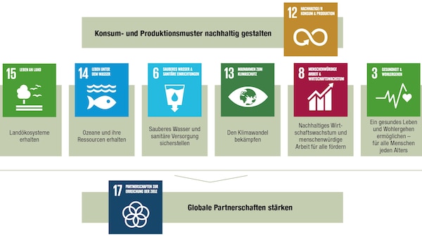 Die Vereinten Nationen haben 17 SDGs definiert und EDEKA sieht sich insbesondere acht dieser Ziele verpflichtet, da sie durch das Handeln entlang der Wertschöpfungskette berührt werden. So bezieht sich SDG 12 auf das wirtschaftliche Handeln aller Akteurinnen und Akteure im Lebensmitteleinzelhandel. Die SDGs 3, 5, 6, 8, 13, 14, 15 und 17 werden insbesondere durch einzelne Projekte und Partnerschaften bedient, wie zum Beispiel die Partnerschaft für mehr Nachhaltigkeit mit dem WWF. Damit kann der EDEKA-Verbund seine Kapazitäten zusätzlich stärken und nachhaltigeren Konsum ganzheitlich fördern.