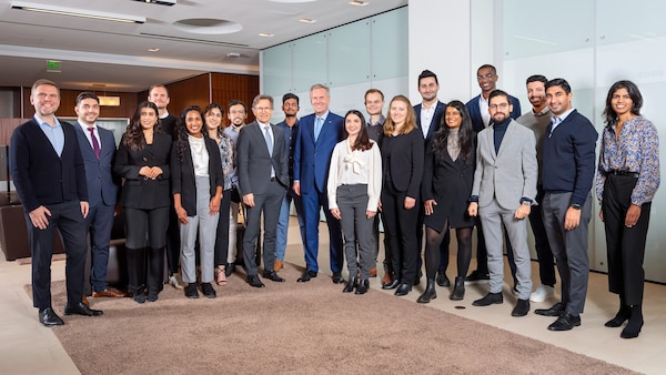 Herr Mosa, Vorstandsvorsitzender EDEKA ZENTRALE Stiftung & Co. KG, mit Herrn Wulff, Bundespräsident a.D., und Herrn Ciechanowicz, Geschäftsführer der Deutschlandstiftung Integration, sowie GEH DEINEN WEG-Stipendiat:innen beim Kamingespräch in der EDEKA-Zentrale.